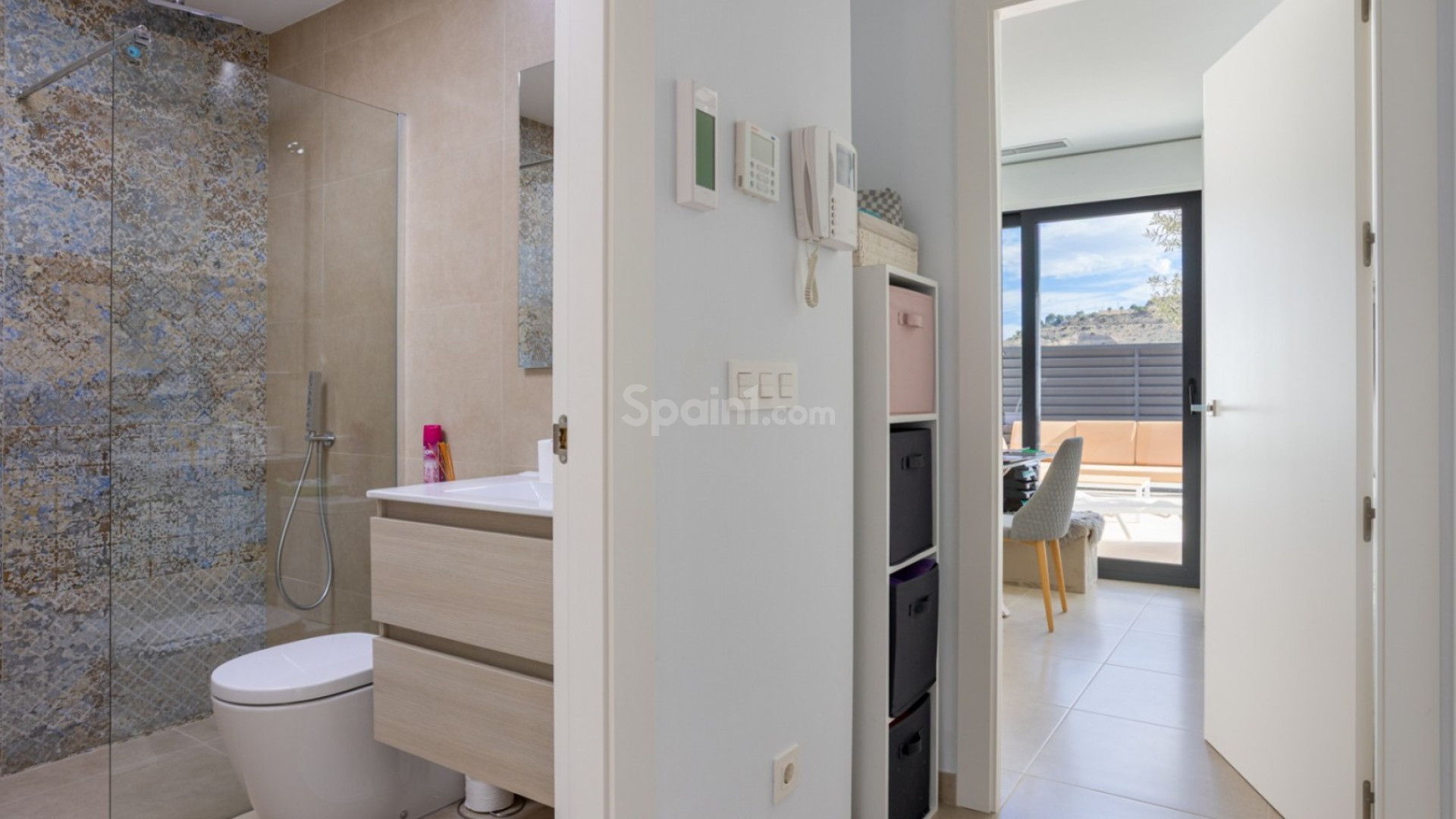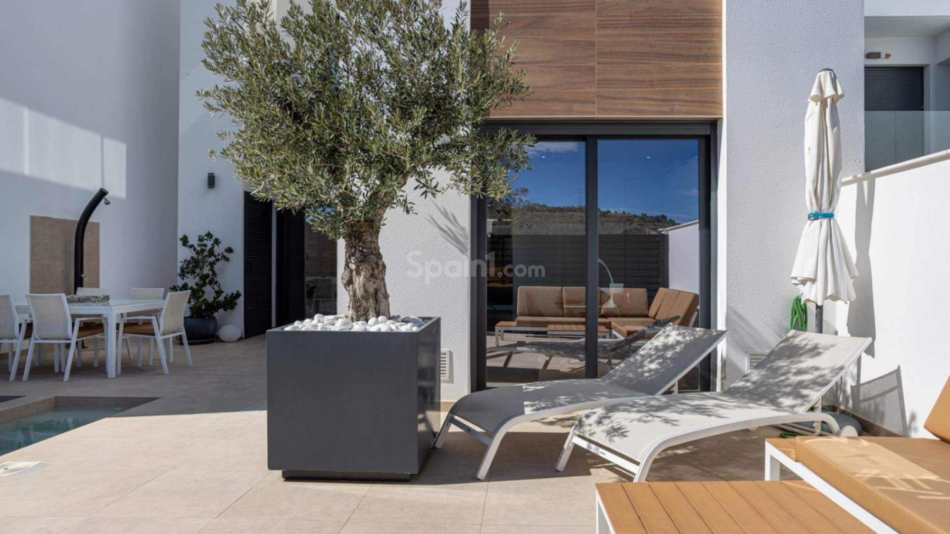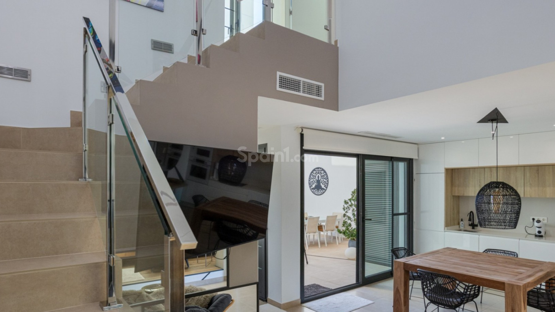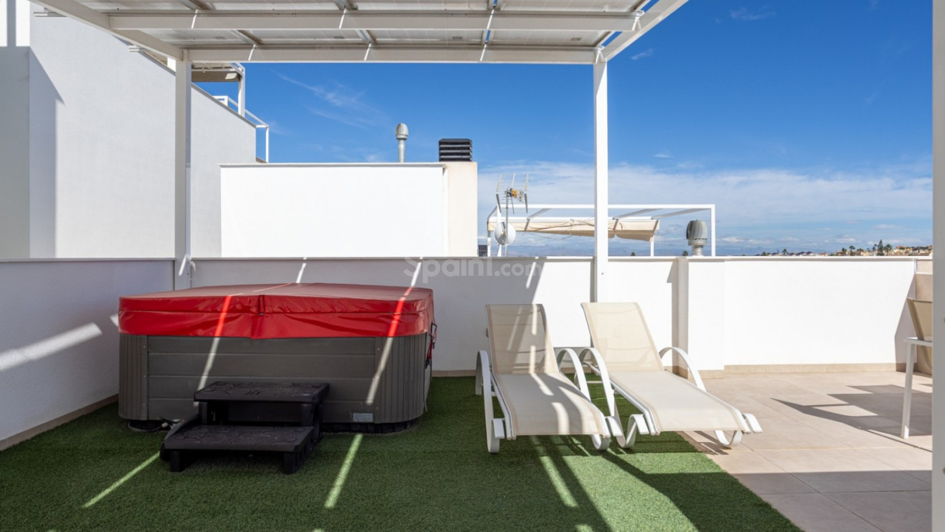 Diese Immobilie aus dem Jahr 2018 befindet sich in einer der begehrtesten und am schnellsten wachsenden Gegenden der südlichen Costa Blanca. Sie liegt direkt gegenüber einem geschützten Park, auf dem keine zukünftige Bebauung möglich ist, und bietet dadurch Ruhe, Privatsphäre und dauerhafte freie Aussicht. Das Ortszentrum mit Restaurants, Geschäften und allen Einrichtungen ist fußläufig erreichbar. Der helle Wohn- und Essbereich mit offener Küche ist modern gestaltet und vollständig ausgestattet. Große Fenster sorgen für viel Tageslicht und direkten Zugang zur Terrasse und zum privaten, beheizten Pool mit Wärmepumpe. Das Haus verfügt über drei Schlafzimmer und drei Badezimmer, alle en-suite. Ein Schlafzimmer wird derzeit als Ankleidezimmer und ein weiteres als Büro genutzt, kann jedoch problemlos wieder als Schlafzimmer eingerichtet werden. Im Außenbereich befinden sich der private beheizte Pool, Terrasse, Balkon sowie eine großzügige Dachterrasse mit Panoramablick. Die Immobilie ist mit Solaranlage und Ladestation für Elektrofahrzeuge ausgestattet und wird komplett möbliert verkauft.