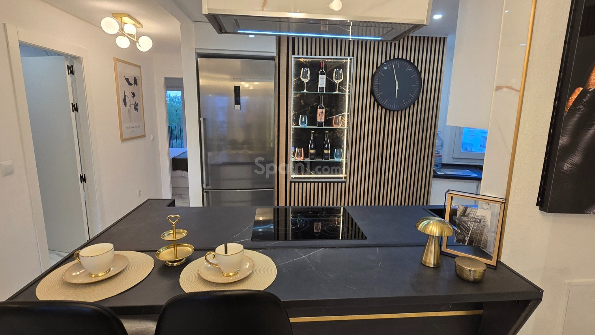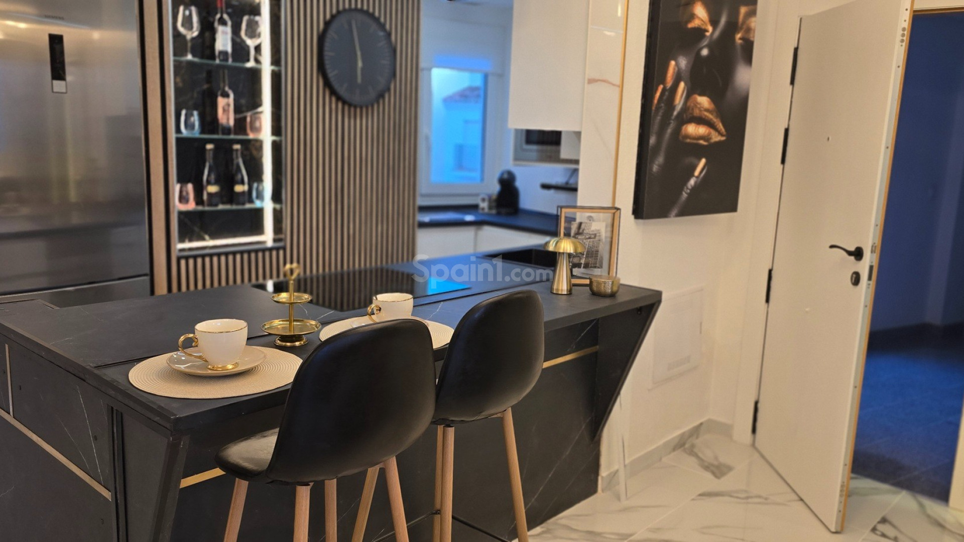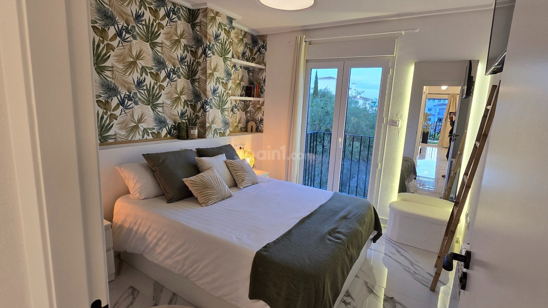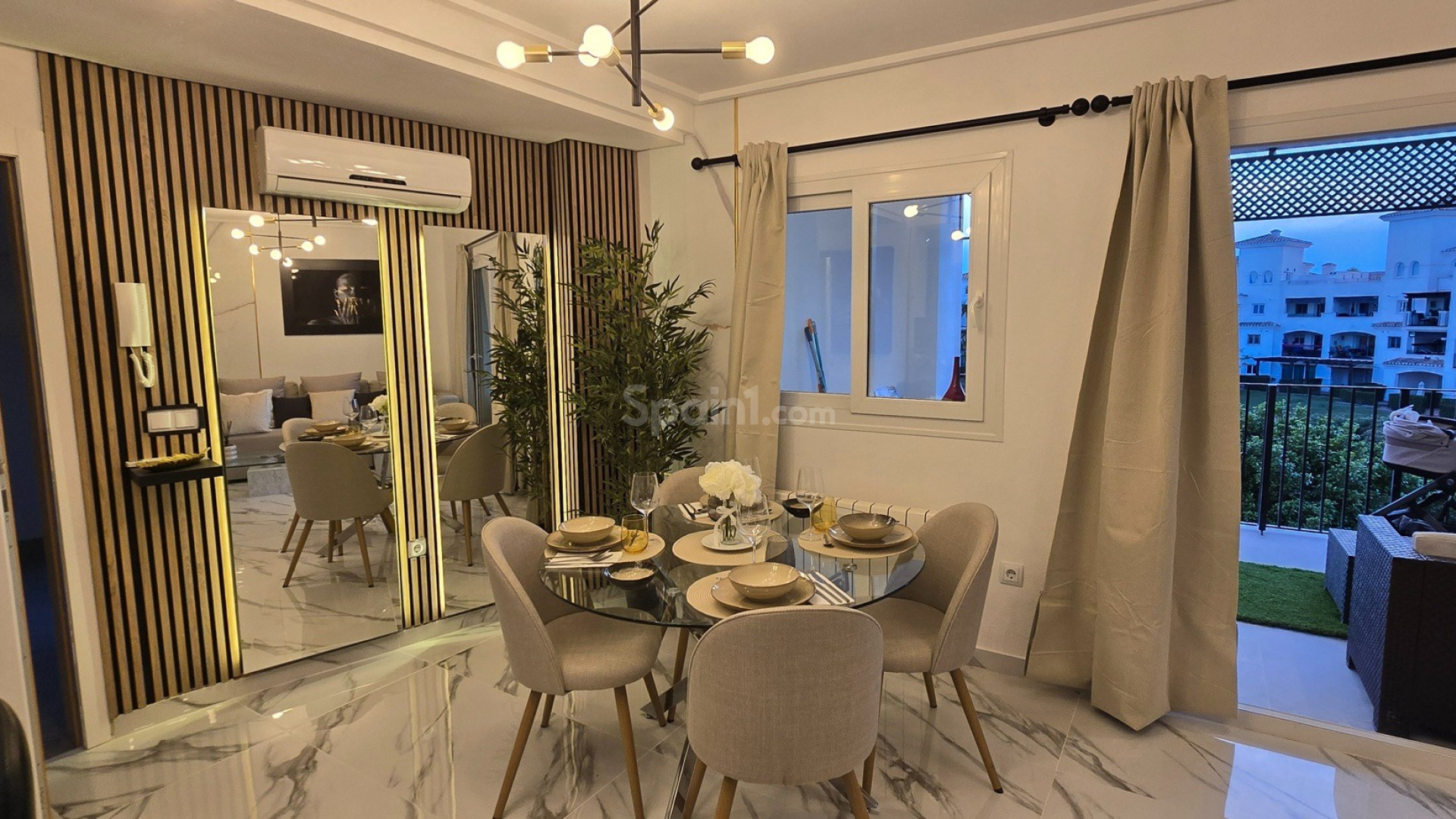 Totalrenovert leilighet i Hacienda Riquelme Golf Resort. Oppdag denne eksklusive, totalmoderniserte og eksklusive designleiligheten i andre etasje, perfekt beliggende nær klubbhuset til det prestisjefylte Hacienda Riquelme Golf Resort i Murcia. Dette er en unik mulighet for de som søker luksus, komfort og et virkelig nøkkelferdig hjem ferdigstilt til høyeste standard. Denne fantastiske leiligheten har blitt fullstendig forvandlet. Fra det stilige nye gulvet til det fullstendig redesignede åpne kjøkkenet, det elegante, moderne badet og de raffinerte finishene gjennomgående – hver detalj utstråler kvalitet og raffinement. Den lyse, åpne stuen har en spesiallaget mediavegg og store skyvedører som fører til en vestvendt terrasse med utsikt over bassenget. Det nye designerkjøkkenet er fullt utstyrt med hvitevarer av høy kvalitet. Begge soverommene har innebygde garderober, takvifter og fransk balkong, mens det renoverte badet har et friskt, moderne utseende. Leiligheten selges fullt møblert, noe som gjør den klar til innflytting umiddelbart. Den inkluderer også en sikker, underjordisk parkeringsplass med heis til alle etasjer. Hvis du leter etter en stilig, nøkkelferdig designleilighet med førsteklasses beliggenhet – er dette et absolutt must. Interessert? Send en melding til Iris på iris@global-spain.com eller send en Whatsapp til: +32 499 73 55 34