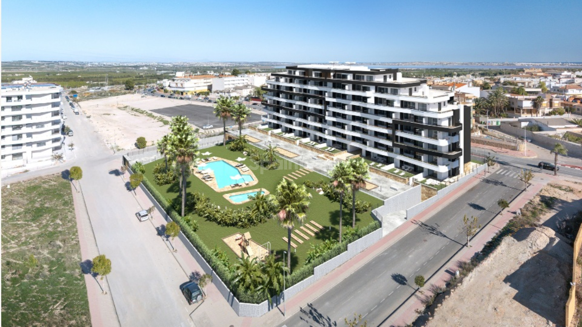 Nye leiligheter i San Miguel de Salinas. Nytt inngjerdet boligområde har leiligheter i den syv etasjers bygningen. Leilighetene har 2 soverom, 2 bad, stue, terrasse og kjøkken. Prisen inkluderer møbler, hvitevarer og en parkeringsplass. Boligområdet vil også ha grøntområder og et felles svømmebasseng. Boligområdet vil også ha vakker utsikt over de omkringliggende områdene. San Miguel er en typisk spansk by som ligger bare 20 minutters kjøretur fra sandstrendene og mindre enn 40 minutter fra to internasjonale flyplasser, Murcia og Alicante. Her finner du også alle nødvendige fasiliteter: en rekke spanske barer og restauranter som tilbyr smakfulle tapas, post, bankkontorer og supermarkeder.
