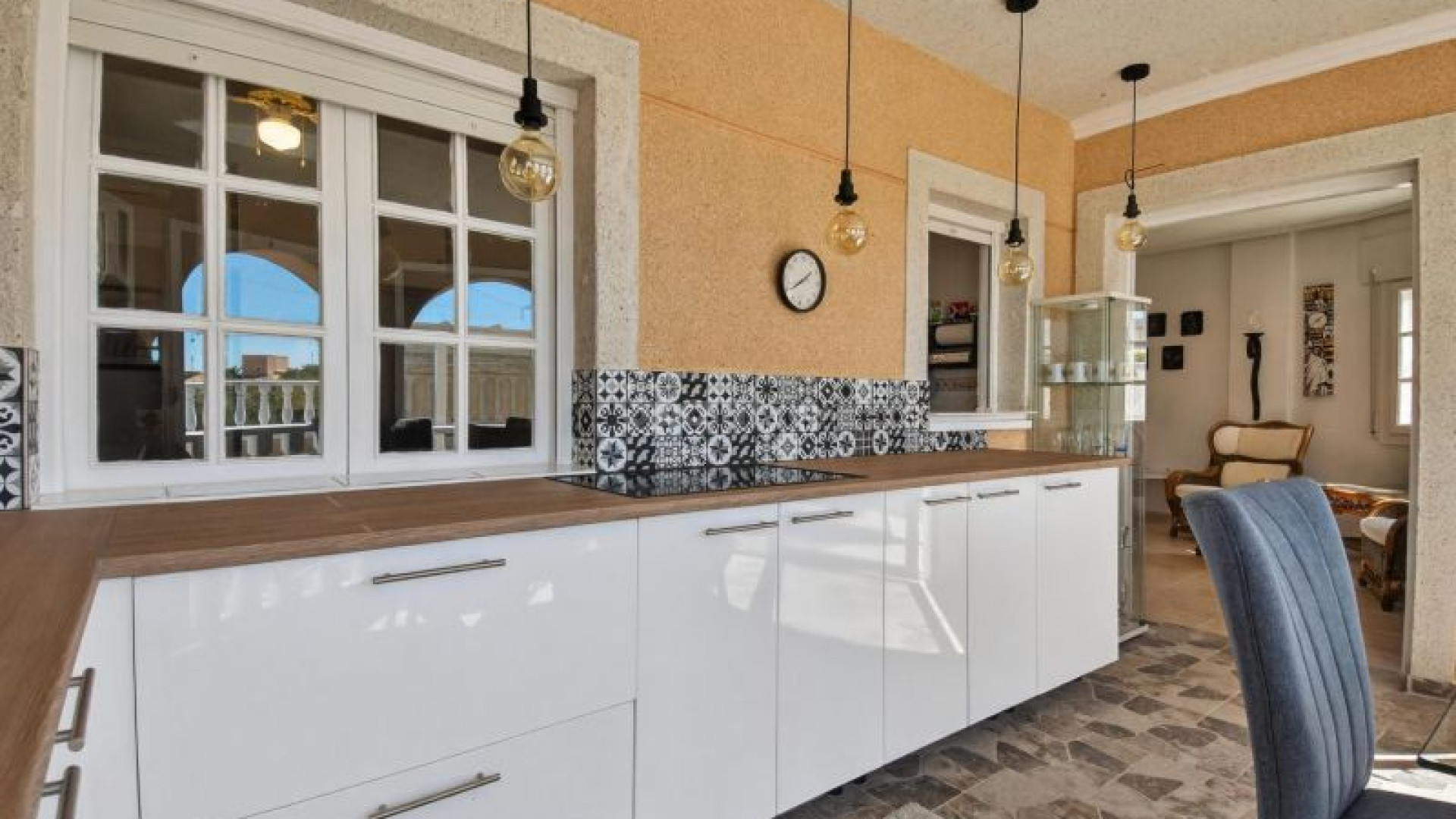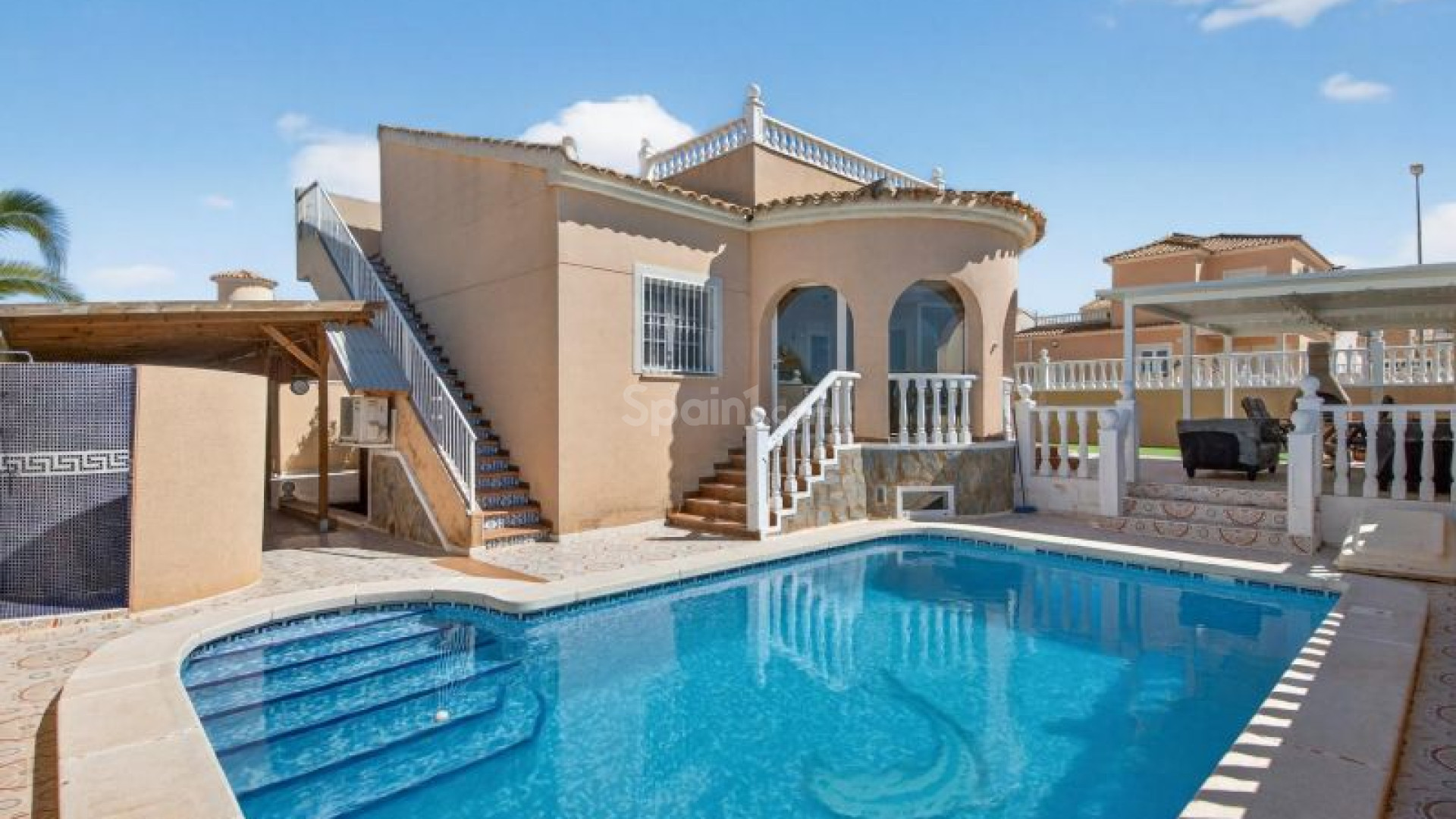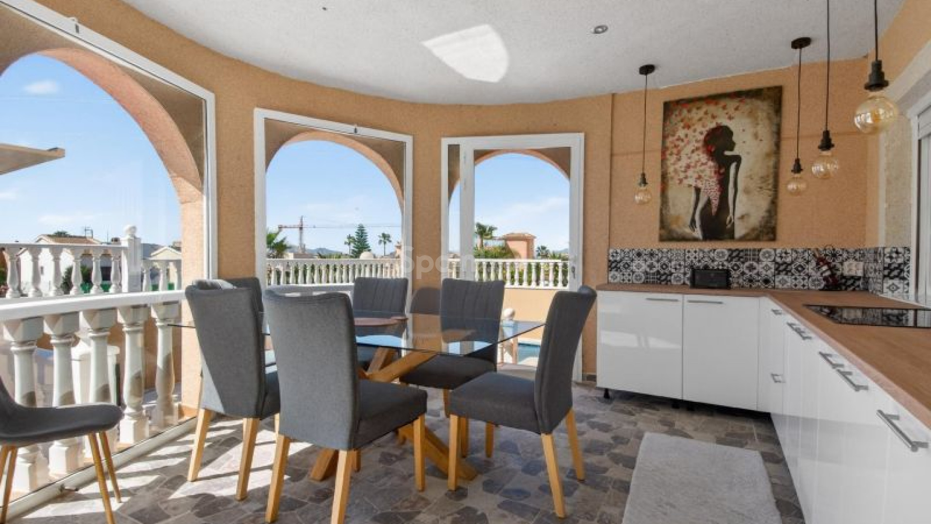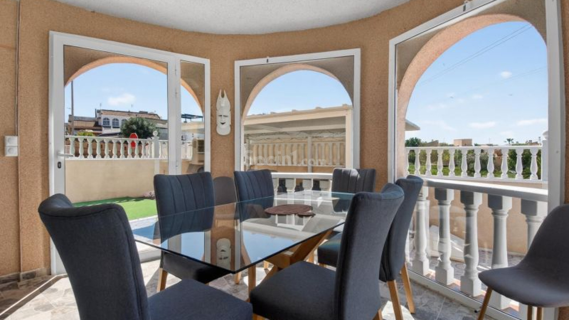 Frittstående villa i Atalaya Park - Benijófar på en tomt på 408 m², designet for komfortabel bolig på ett plan med flotte uteområder. Boligen har en lys stue og spisestue med peis, samt et fullstendig renovert moderne åpent kjøkken, som skaper et praktisk og moderne oppholdsrom. Den består av 3 soverom og 2 bad, i tillegg til en romslig innglasset terrasse, perfekt for bruk hele året. På toppen finner du et takterrasse/solarium, ideelt for å nyte solen hele dagen takket være alle himmelretninger, som gir rikelig med naturlig lys. Uteområdet skiller seg ut med en hage med frukttrær, kombinasjon av flislagte områder og kunstgress, samt et privat svømmebasseng. Eiendommen har også overbygd parkering på tomten og en pergola tilrettelagt for grill og avslapning. I tillegg finnes det en kjeller som brukes som bod, som gir ekstra lagringsplass. Boligen ligger i et område i vekst og svært populært blant internasjonale kjøpere, med alle nødvendige fasiliteter i nærheten, inkludert supermarkeder, internasjonale restauranter, butikker og fritidstilbud. Den ligger også nær kjøpesentre, golfbaner som La Marquesa i Rojales, og strendene i Guardamar, med enkel tilgang til hovedveier og flyplassen. Selges møblert og er et utmerket valg både som helårsbolig og feriebolig. Ta kontakt for mer informasjon eller avtal en visning.