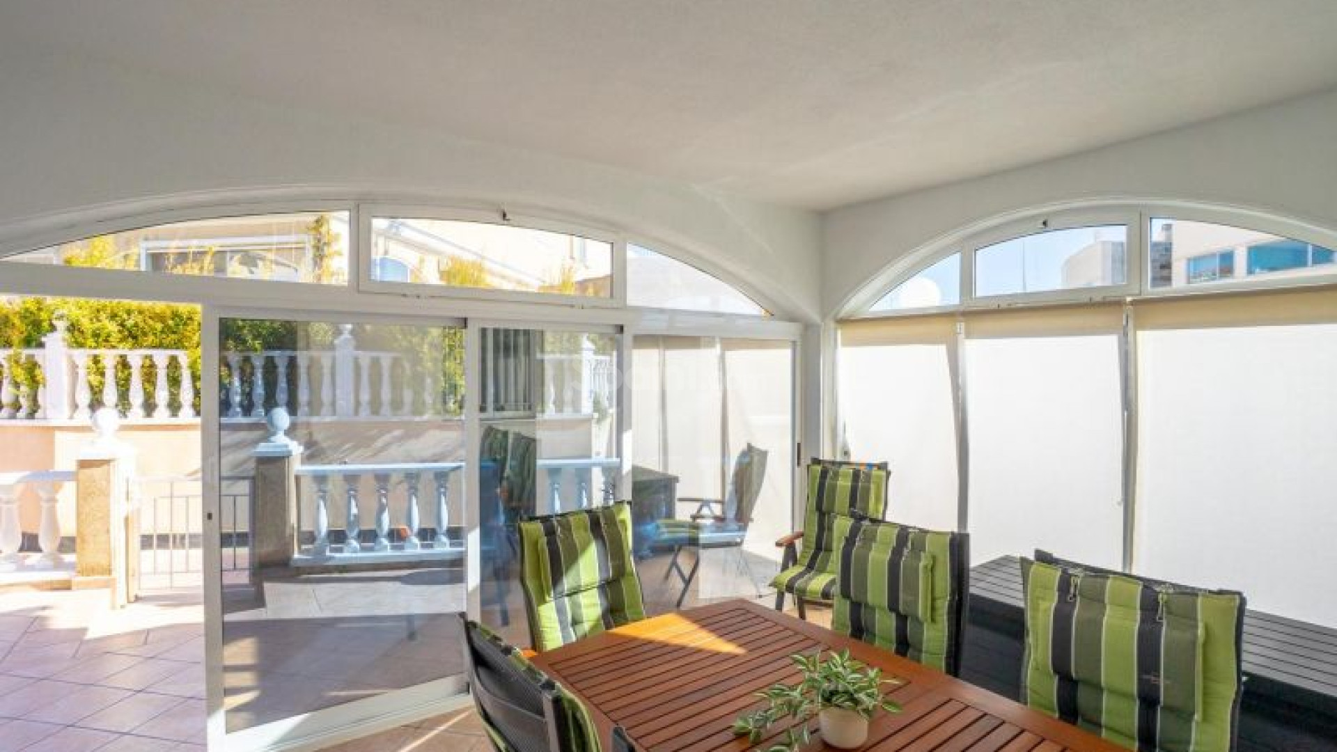 Corner Quad-style townhouse, distributed over two floors plus ROOF TERRACE connected by an internal staircase and located just a few steps from the communal swimming pool, within the highly sought-after Zeniamar V development in Orihuela Costa. A bright and comfortable home, ideal as a permanent residence or a holiday property.The residential complex offers well-maintained gardens, a large communal pool and a peaceful atmosphere, all within easy reach of supermarkets, cafés, restaurants, the popular Zenia Boulevard shopping centre, Playa Flamenca market and the beaches of Orihuela Costa. On the ground floor, the property features a spacious glazed terrace leading into the living room, a fully equipped open-plan kitchen with appliances and utility area, one bedroom, a renovated bathroom with underfloor heating, and a useful storage room. The first floor offers two additional bedrooms, a second bathroom and a terrace with both glazed and open areas, enjoying open views and providing an ideal space for relaxation. The top floor level includes a versatile room suitable for various uses (storage, office or relaxation area even for sleeping) and a large open terrace, perfect for enjoying the excellent year-round climate. Outside, the property boasts a corner tiled garden of approximately 69 m², with ample space for outdoor dining, a barbecue or a chill-out area for social gatherings. The property is presented in excellent condition, equipped with inverter air conditioning units in all rooms, sold fully furnished and equipped, and includes a private parking space and storage room with extra size door for a motorcykle in the underground garage. Contact us today for further information or to arrange a viewing and experience this property first-hand.