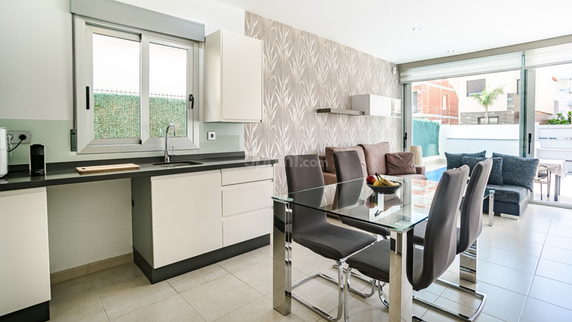 Discover this beautiful villa located in charming Lo Pagán , in San Pedro del Pinatar just 500 meters from the sea . This well-maintained property combines comfort, space, and an excellent location on the Costa Cálida, ideal as a holiday home, investment, or permanent residence. The villa, built in 2015 , stands on a plot of 162 m² and features a built area of 109 m² , distributed over two floors . Inside, you will find three spacious bedrooms and two bathrooms , making the home perfectly suitable for families or entertaining guests. Outdoor living takes center stage here thanks to the three terraces , two of which are on the upper floor , ideal for enjoying the sun and the Mediterranean climate. The south-facing terrace is equipped with new garden furniture and a new awning (2025) , allowing you to relax comfortably outdoors all year round. Additionally, the property features a private swimming pool , perfect for cooling off during hot summer days. The fully equipped kitchen features all necessary appliances, including a microwave, ceramic hob with oven, refrigerator, and freezer . Furthermore, there is a separate storage room with a washing machine for extra practical convenience. For a pleasant indoor climate, the villa is equipped with newly installed ducted hot/cold air conditioning (2025) in all rooms, which can also be controlled remotely via an app . Naturally, internet access is also available. With its excellent location close to the sea, modern amenities, and pleasant outdoor spaces, this villa is an ideal place to enjoy the Mediterranean life. Energy label: D Interested in this beautiful seaside villa? Contact us today for more information or schedule a viewing. We would be happy to help you discover this home for yourself!