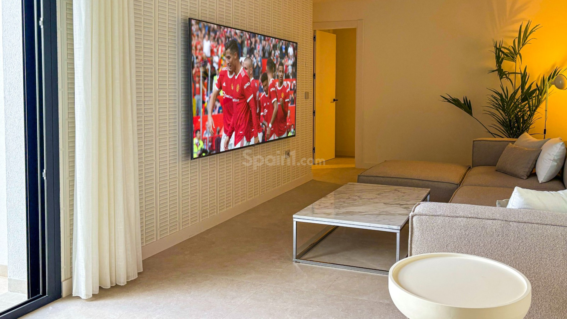 Vardagsrummet och köket har ett elegant neutralt färgschema som skapar ljusa och luftiga utrymmen som smälter samman med utomhusterrassen och den stora poolen.