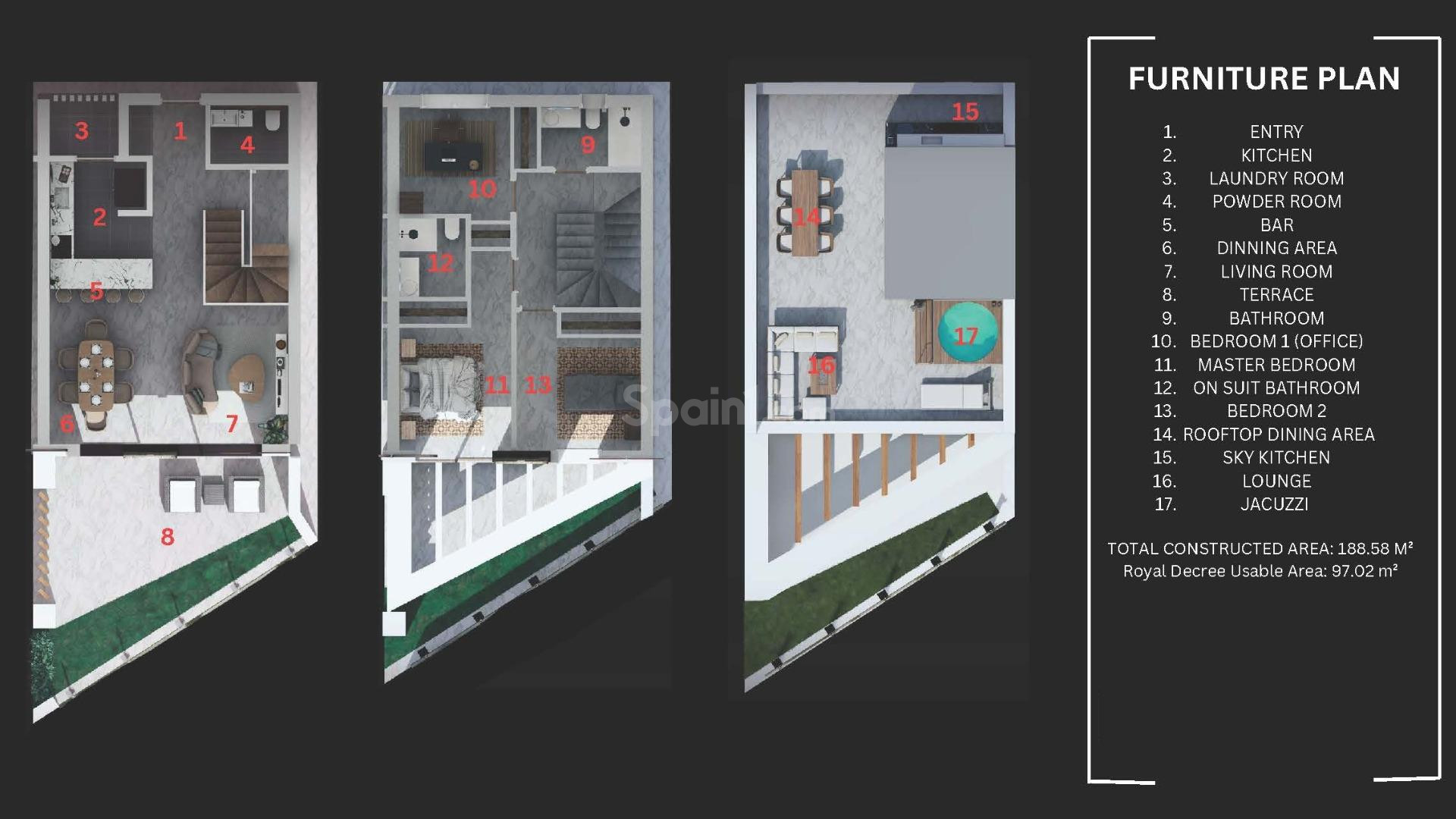 Nybyggda radhus i El Chaparral Mijas Modernt boende nära havet Exklusivt bostadsprojekt i El Chaparral Mijas Välkommen till detta boutique-nybyggnationsprojekt beläget i de fridfulla tallklädda kullarna i El Chaparral Mijas. Detta exklusiva bostadskomplex består av endast 22 moderna radhus med tre sovrum, utformade för att erbjuda avskildhet, komfort och en raffinerad medelhavslivsstil. El Chaparral är ett högt ansett bostadsområde känt för sin naturliga omgivning, närhet till kusten och enkel tillgång till viktiga destinationer längs Costa del Sol. Moderna hus med flexibla planlösningar Projektet erbjuder ett urval av radhus och hörnenheter noggrant utformade för att maximera ljusinsläpp och avskildhet. Varje hem är fördelat på två huvudvåningar plus ett privat takterrass med solterrass. På bottenvåningen hittar du ett öppet vardagsrum och matplats med integrerat kök, tvättstuga, gästtoalett och direkt tillgång till terrassen och den privata trädgården. Övre våningen har tre dubbelrum och två badrum, inklusive ett sovrum med eget badrum. Vissa enheter har en underjordisk våning som kan anpassas som ett spelrum, hemmagym eller privat biorum beroende på dina livsstilsbehov. Parkering ingår antingen utomhus eller underjordisk beroende på fastighetstyp. Privat solarium med havsutsikt Takterrassen erbjuder en idealisk plats för att njuta av medelhavsklimatet och den öppna havsutsikten. Detta område erbjuder möjligheten att installera en pool och ett sommarkök, vilket skapar en perfekt miljö för avkoppling och underhållning. Högkvalitativa specifikationer och modern komfort Alla bostäder är byggda med förstklassiga ytbehandlingar och modern teknik. Funktionerna inkluderar fullt installerad luftkonditionering, uppvärmning med aerotermiskt system och fullt utrustade kök med avancerade Siemens-apparater. Glasfönster från golv till tak förstärker det naturliga ljuset och skapar en sömlös koppling mellan inomhus- och utomhusmiljöer. Varje hems orientering har noggrant planerats för att säkerställa avskildhet och optimal användning av medelhavsljuset. Gemensamma utrymmen i resortstil De boende kan njuta av ett komplett fritidsområde utformat för välbefinnande och avkoppling. Faciliteterna inkluderar ett fullt utrustat gym, bastu och jacuzzi. Utomhus är den gemensamma poolen och barnpoolen omgivna av tropiska trädgårdar som erbjuder en lugn och familjevänlig miljö. Utmärkt läge nära golfstränder och städer El Chaparral Golf Club ligger bara några minuter bort, vilket gör detta till ett utmärkt val för golfälskare. Sandstränderna i Mijas Costa ligger cirka 0,8 km bort och är lättillgängliga till fots. La Cala de Mijas med sina restauranger, butiker och strandpromenad ligger i närheten, medan Fuengirola, Marbella och Puerto Banus alla ligger inom en kort bilresa. Viktiga avstånd till sevärdheter: Stranden i Mijas Costa: 0,8 km, El Chaparral Golfklubb: 1 km, La Cala de Mijas: 3 km, Fuengirola: 6 km, Marbella: 20 km, Puerto Banus marina: 22 km, Malagas flygplats: 30 km. Ditt nya hem på Costa del Sol. Njut av lugn design och ett utmärkt läge vid kusten i ett av de mest attraktiva områdena i Mijas. Kontakta oss idag för att få mer information eller för att boka en privat visning av dessa exklusiva nybyggda radhus.