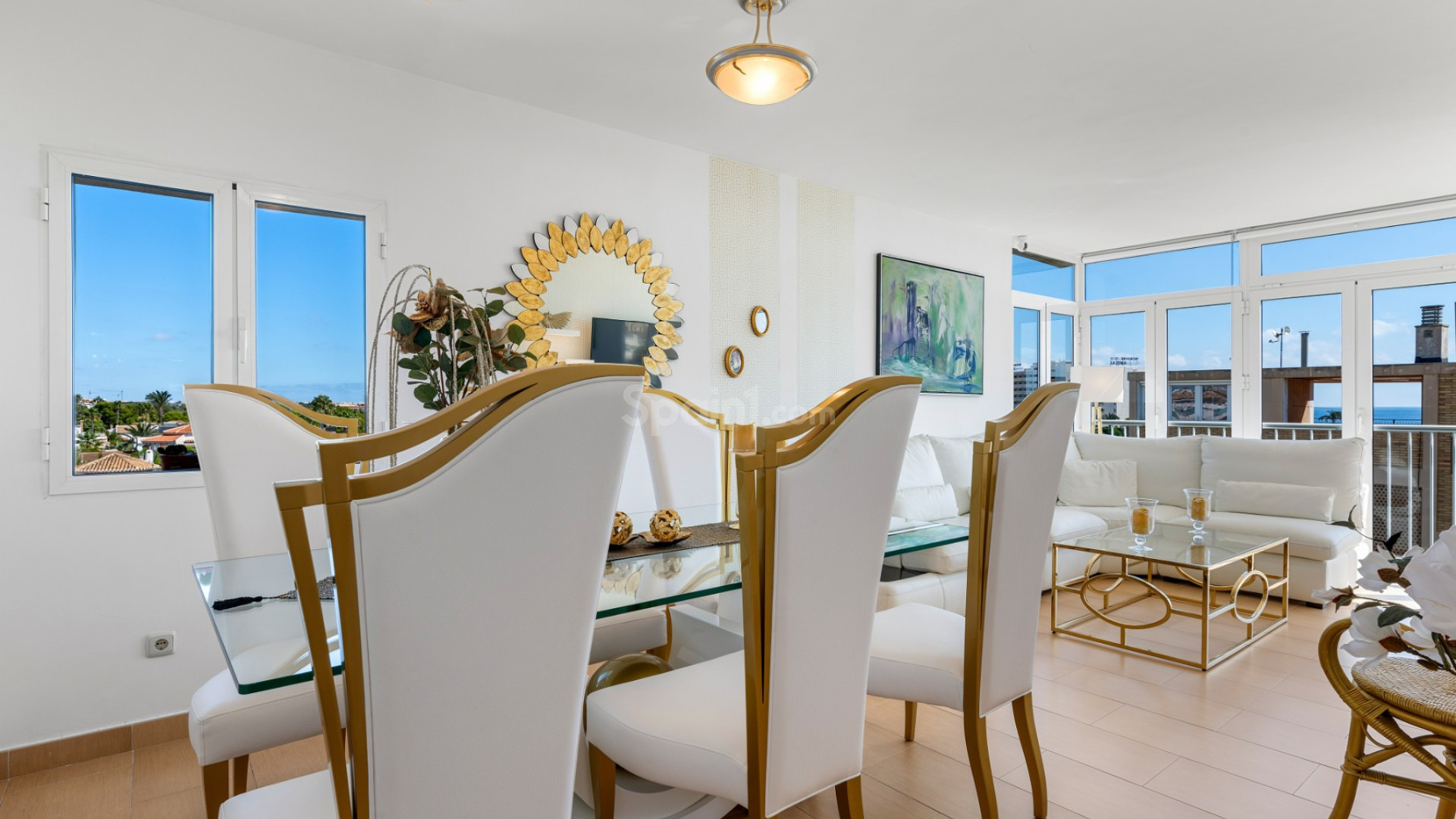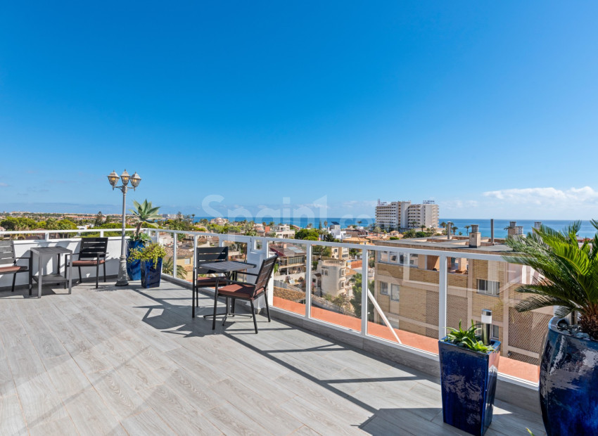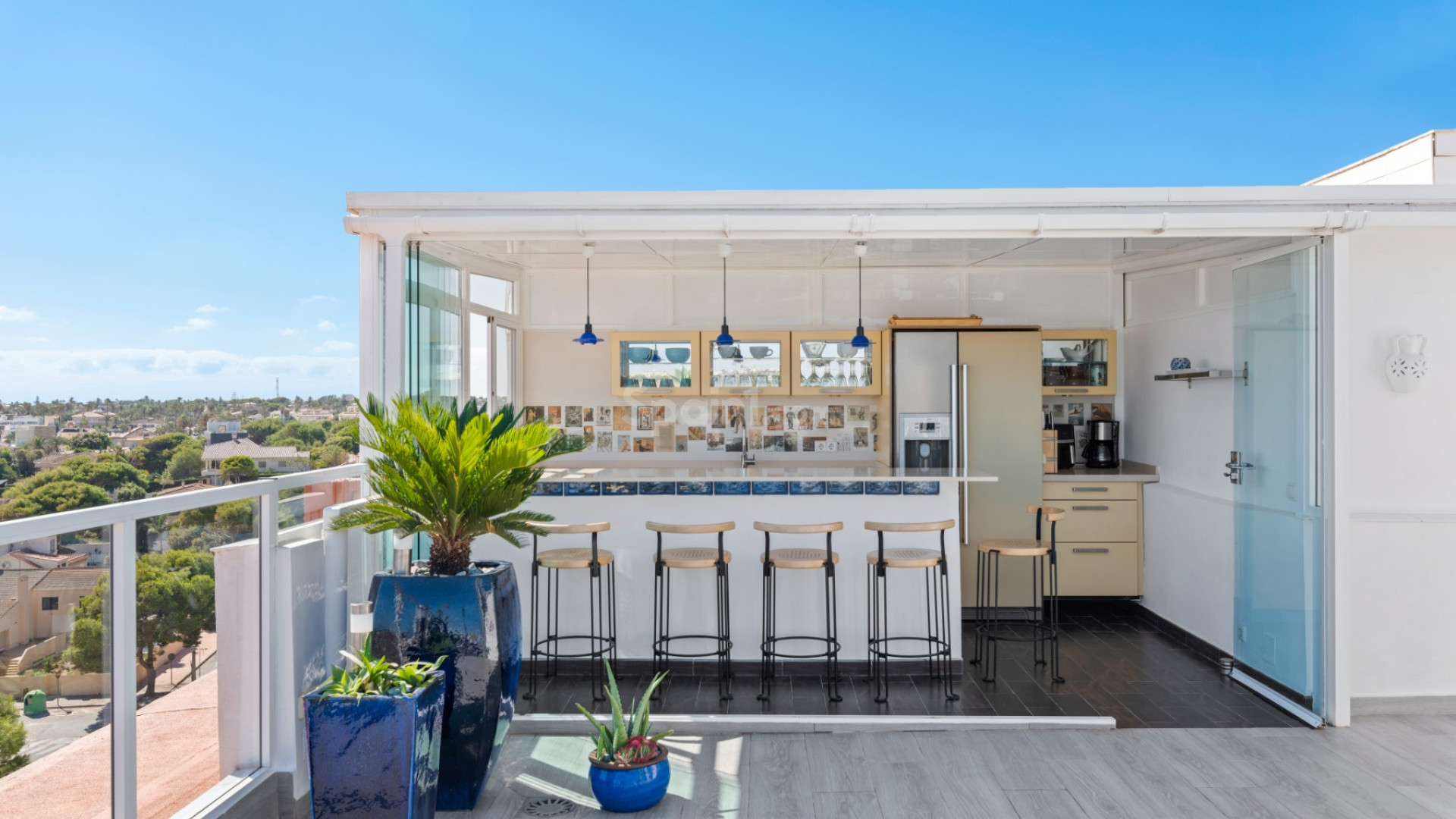 Denna takvåning ligger högst upp på La Zenias skyline och representerar ett lyxigt boende vid kusten. Hjärtat av hemmet ligger i dess expansiva stora toppterrass, en hisnande fristad med panoramautsikt över det blå havet och den solkysste horisonten. Här inbjuder ett noggrant utformat utekök och sittgrupp med eget badrum att äta utomhus under Medelhavets stjärnor.